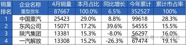 东风4月重卡销量1.5万辆,排名行业第二位,本月占比17.2%,仅次于中国重汽;1~4月累计销量5.46万辆,累计市占率15.5%,排名行业第四位,仅次于中国重汽、一汽解放、陕汽(数据来源中汽协)。