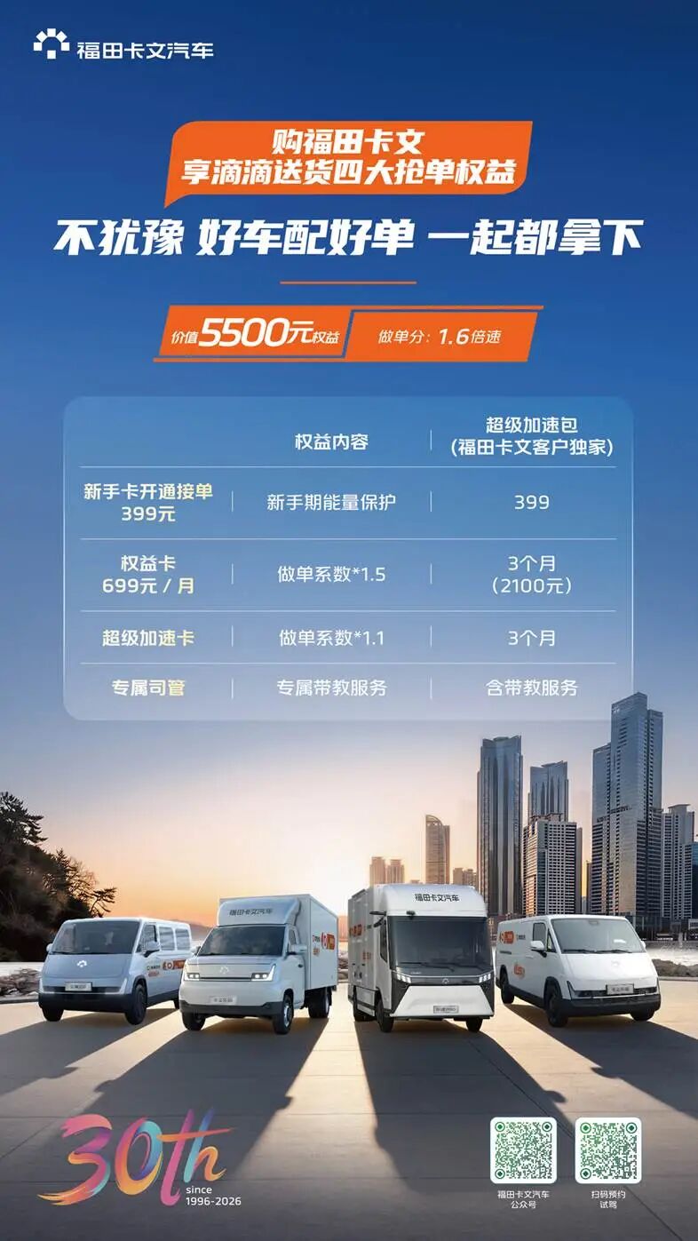 2026年4月,福田汽车旗下新能源商用车专属品牌福田卡文汽车,正式推出重磅购车权益:凡在官方授权门店购买卡文乐福、卡文乐迪、卡文乐途三大系列任意车型,提车即可免费申领总价值5500元的滴滴送货抢单权益套餐。这套方案跳出传统价格促销的局限,直击司机增收全链路痛点,以“产品+权益+服务”的组合拳,为从业者打通从上路到稳赚的完整路径,真正践行“让每一公里更美好”的品牌使命。