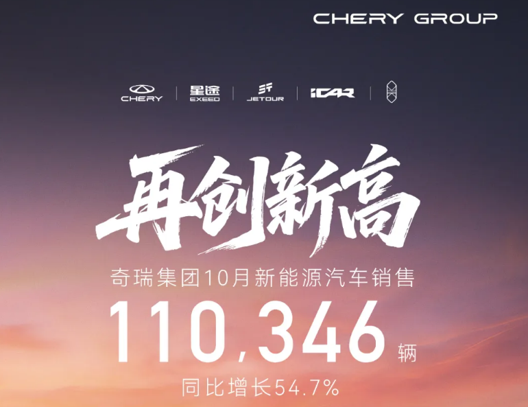 单月新能源突破11万!奇瑞集团10月销量新能源车110346辆