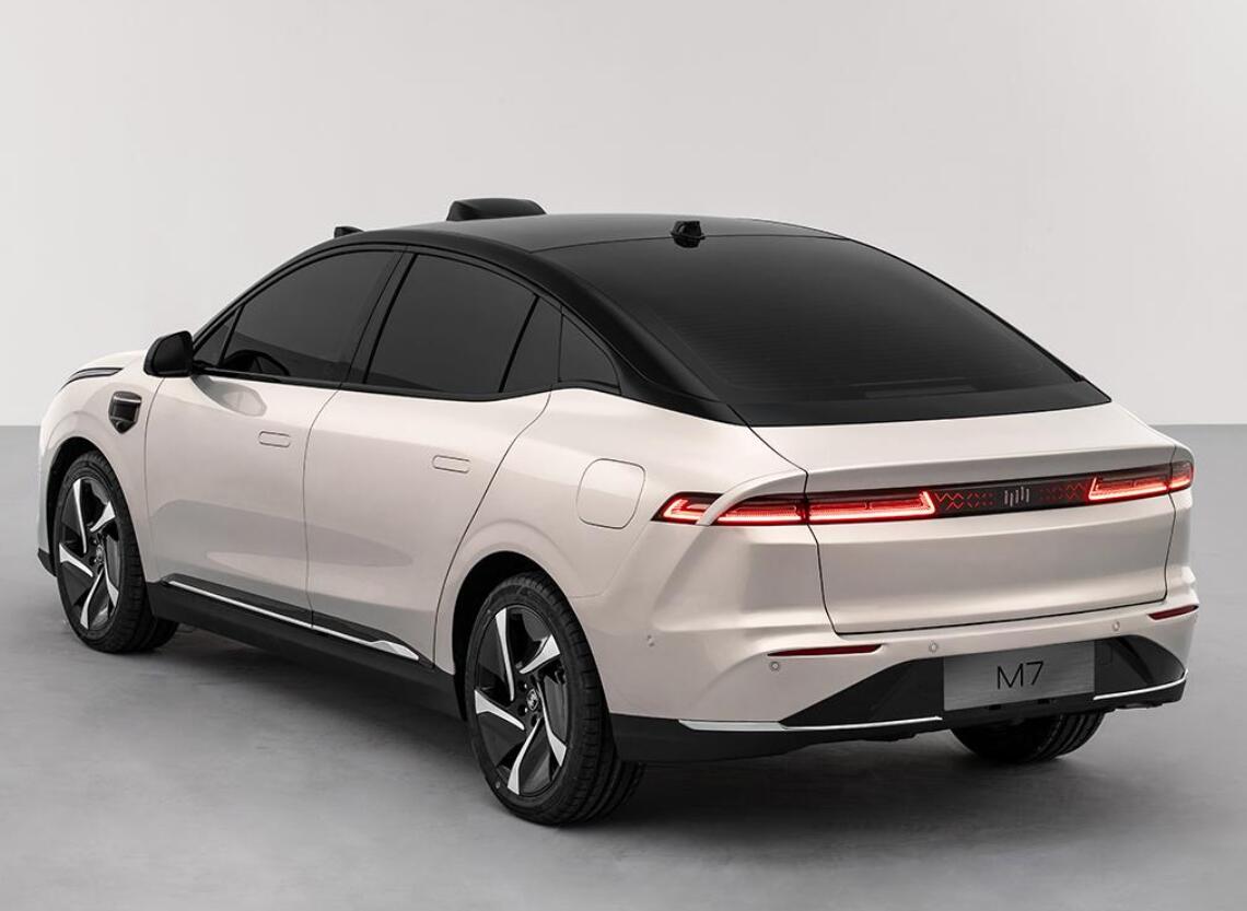 而在车身侧面,新车虽然公布了近5m的车身长度和近3m的轴距,然而并没有显得非常低矮修长,反而显得有些高胖,从这一角度似乎更像是极狐阿尔法S。当然除了撞色车身,黑色后视镜罩,气动轮毂及隐藏式门把手等电动车的立牌设计外,最为醒目的当属悬挂于车顶的夸张探头。官方声称威马M7搭载了3颗自主变焦高精度超市激光雷达,以及五个毫米波雷达,12个超声波雷达,7个800万像素高清摄像头及4个200万像素高清环视摄像头,在感知设备配置上,绝对处于目前的领先水平。