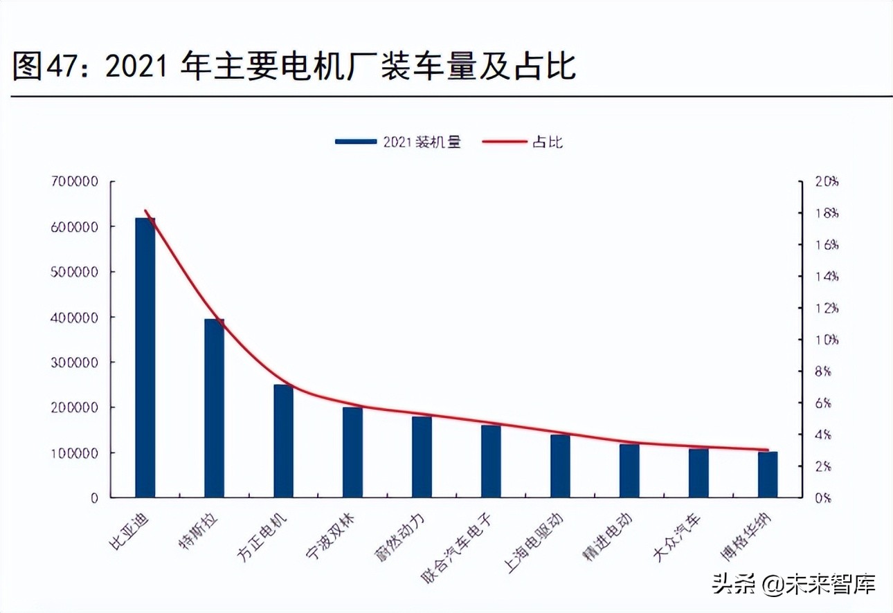 根据高工锂电的数据,在国内主要电机厂商中,2020 全年前两名的厂商(比亚迪/特斯拉)市场份额合计达到了 26%,前五名的厂商合计市场份额达到了48%,前十名的厂商合计市场份额达到了 71%。2021 全年,前两名的厂商(比亚迪/特斯拉)合计市场份额达到了 30%,前五名的厂商合计市场份额达到了48%,前十名的厂商合计市场分额达到了 67%。