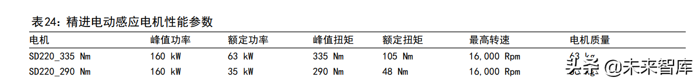在乘用车驱动电机方面,公司产品主要有感应电机、水冷永磁电机和油冷永磁电机。公司的感应电机分 SD220_335 Nm 和 SD220_290 Nm 两种型号,属于三相感应电机,具有转矩密度、功率密度高,电机系统效率高,电机电磁噪声低,NVH性能好,低转矩纹波等优势。电机配有寿命长、耐电晕电机漆包线、加重型驱动电机输出轴承,整机全面防腐蚀表面处理。