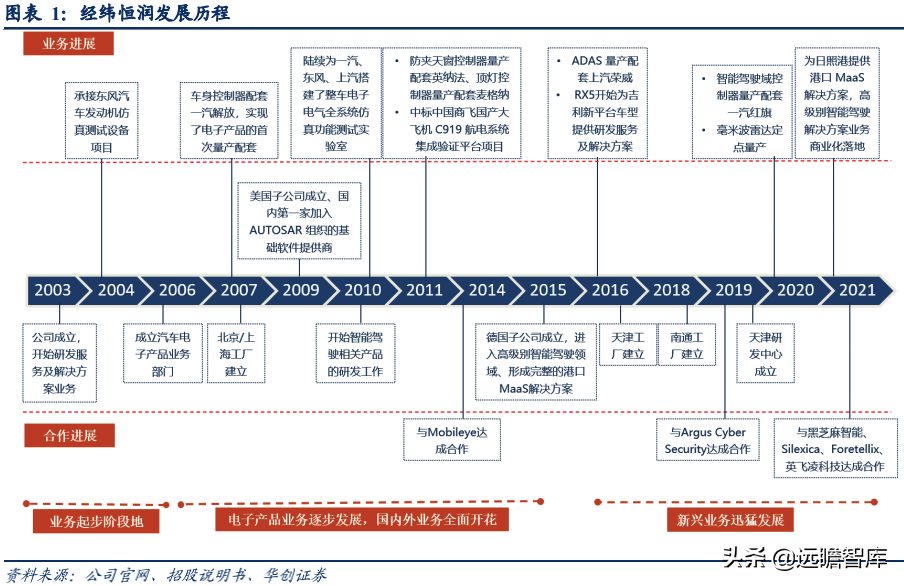 浏览:7990经纬恒润于 2003 年成立开展电子系统的研发服务及解决方案业务,2006 年进入汽车电子领域,2016 年进入高级别智能驾驶业务领域。经过近 20 年的成长积淀,公司主要业务包括电子产品业务、研发服务及解决方案、高级别智能驾驶整体解决方案,客户覆盖汽车、高端装备、无人运输等领域。受益最核心业务电子产品、尤其是智能驾驶电子产品、智能网联电子产品的持续增长。