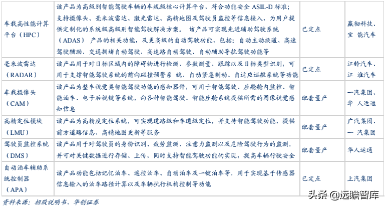 公司 2010 年起着手研发智能驾驶电子产品,ADAS 打破国外公司垄断,2020 年 ADCU开启量产配套。公司 2010 年起开始智能驾驶电子产品研发,目前产品主要包括先进辅助驾驶系统 (ADAS)、智能驾驶域控制器(ADCU)、车载高性能计算平台(HPC)、毫米波雷 达(RADAR)、车载摄像头(CAM)、高精定位模块(LMU)、驾驶员监控系统(DMS) 和自动泊车辅助系统控制器(APA)等等。其中,ADAS 2016 年为上汽荣威RX5 车型进行量产配套,打破国外垄断;自主研发的 ADCU 2020 年为一汽红旗 E-HS9车辆进行量产配套。