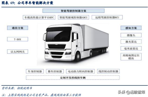 1) 单车智能解决方案:包括基于 SOA 的自动驾驶整车架构、功能安全和信息安 全解决方案、AI 感知算法、自主开发的智能驾驶和智能网联等汽车电子产品和定制开 发的线控车辆。基于运输场景的不同,公司能够提供系统级单车智能驾驶解决方案。