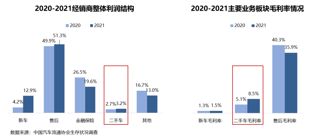 从经销商的利润结构看,新车由于芯片短缺等因素导致产品“供不应求”,新车利润占比增长明显;二手车由于现阶段还存在规模小,销量低于新车等原因,二手车利润占比没有新车高。