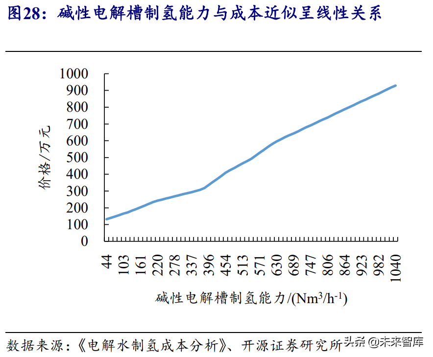 单台电解槽制氢能力制氢能力越大,其购置价格也越高。国内单台电解槽制氢能力 从几十到 1500Nm3 /h(其对应价格在 100 万元至 2000 万元不等)。其中 1000Nm3 /h 的 制氢能力的单台碱性电解槽价格在 700 万~1000 万元之间。国内单台电解槽制氢能 力与其购置成本基本呈线性关系。