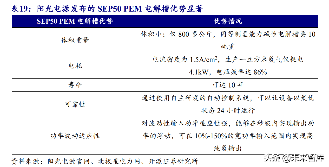 阳光电源大力研发可再生能源制氢设备。2021 年 3 月 18 日,阳光电源发布的国内首 款绿氢 SEP50 PEM 电解槽处于国内领先地位。该电解槽紧凑轻巧,仅 800 多公斤、 直流电耗低、拥有长寿命、高可靠性、功率波动适应性更强等优点。阳光电源正在研 发新一代产品,以实现更高的功率和更长的寿命,并使电解水制氢的成本更低。
