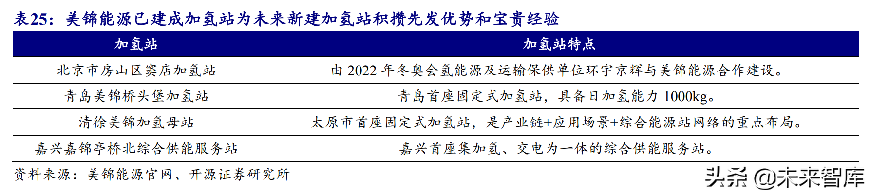 在加氢方面,公司已拥有 8 座已建成加氢站,并将于十四五期间规划建设 100 座加 氢站。公司积极参与加氢站的建设,当前在广东佛山(1 座)、云浮(1 座)、山西晋中(1 座)、山西太原(1 座)、北京市(2 座)、山东青岛(1 座)、浙江嘉兴(1 座)已成功建成加 氢站,为未来新建加氢站积攒先发优势和宝贵经验。2021 年 8 月,美锦能源与中石 化山西分公司签订合作协议,争取到 2025 年,在山西省内合作建设 30 座油氢混合 站。