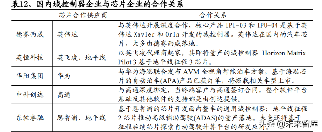 芯片决定了自动驾驶计算平台的算力,设计制造难度大,容易成为卡脖子环节。 高端市场均由国际半导体巨头英伟达、Mobileye、德州仪器、恩智浦等把持;在 L2 及以下的市场以地平线为代表的国内企业也逐渐获得客户的认可。中国的域控制 器厂商一般都会与一家芯片厂家深度合作,采购芯片,配合自身硬件制造、软件 集成能力交付给整车厂。与芯片企业的合作一般具有排他性质。从芯片合作角度 来看,德赛西威绑定英伟达、中科创达绑定高通,优势最明显。国内其他自动驾 驶域控制器企业华阳集团绑定华为海思、东软睿驰与恩智浦和地平线建立合作关 系。