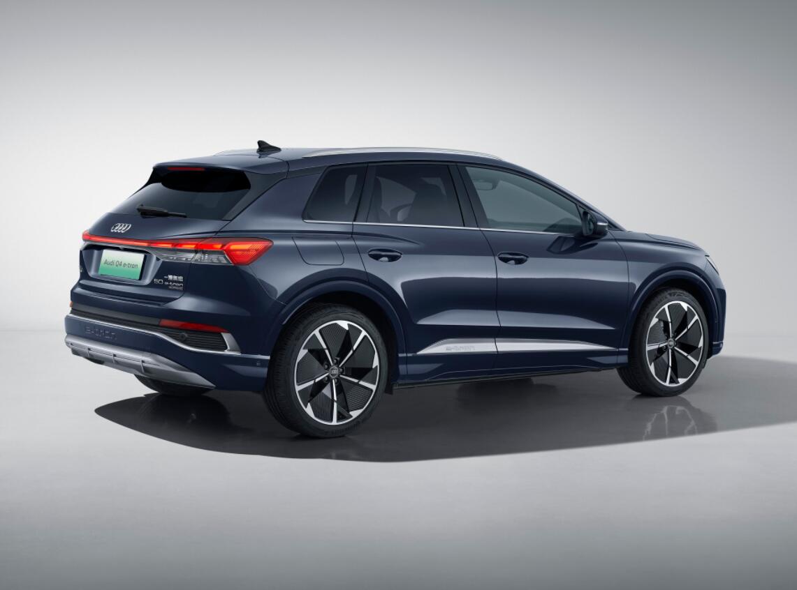在车身侧面,新车则有着MEB平台标志性的超短前后悬,长轴距及低矮的车身比例,但毕竟是奥迪车型,有着更加锐利的车身线条,多段式的动感腰线,且并没有采用隐藏式门把手,配合大尺寸启动轮毂等细节,显得更加高级。