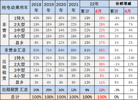 近期新能源乘用车的市场是波动巨大的市场,2020年年初出租租赁电动车市场受到疫情影响持续低迷,其中疫情影响的出租租赁市场受冲击巨大,近期仍较差。4月的出租租赁电动乘用车占比回升到12%,是异常的结构变化。