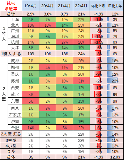 新能源车的市场纯电动份额相对稳定,2022年4月仍达到总体的76%。纯电动在特大型市场表现较强占到纯电动18%比例,而插电混动在纯电动市场总体表现相对是较低的一个状态。插电混动在中型、小型市场都获得较好的增长,而纯电动目前是在大型和中型市场走势相对较强。