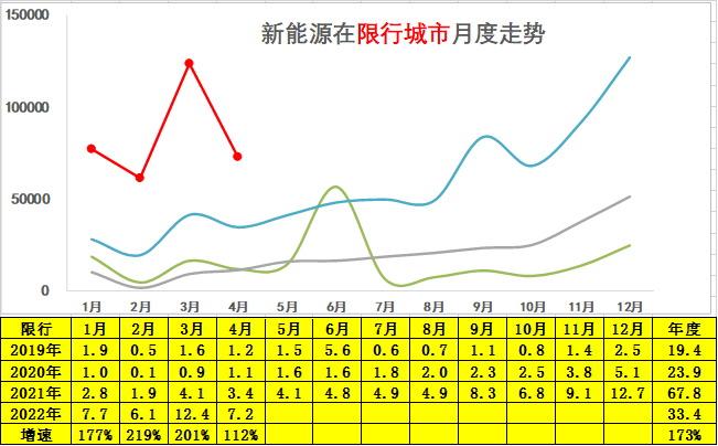 2022年新能源车在非双限城市的表现极其优秀,1月份销售17万台增速很强,3月增速达到183%,4月份销售14.5万台的增速89%。总体来看,1-4月份累计达到68.5万台水平,同比增长156%,呈现了较强增长特征。