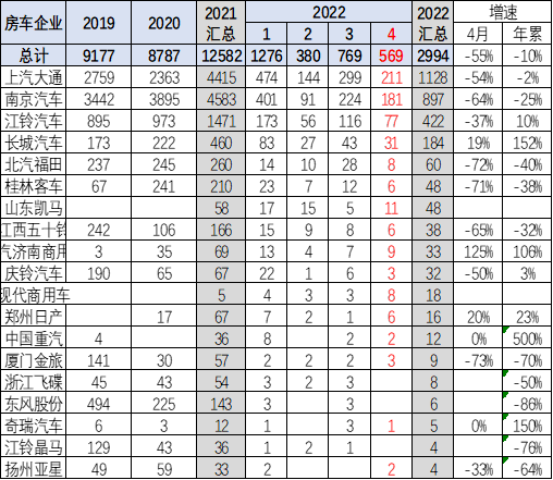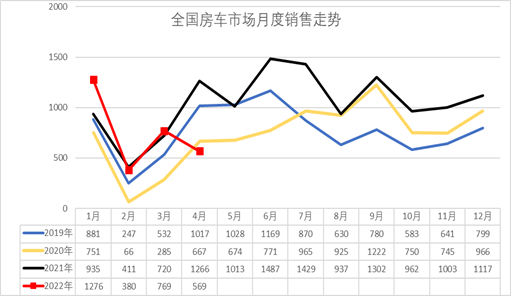 2022年1-4月的房车销量2994台,下降10%,4月的房车销量569台,下降55%,体现了疫情对房车生产的巨大冲击,未来房车市场的消费快速回暖特征。
