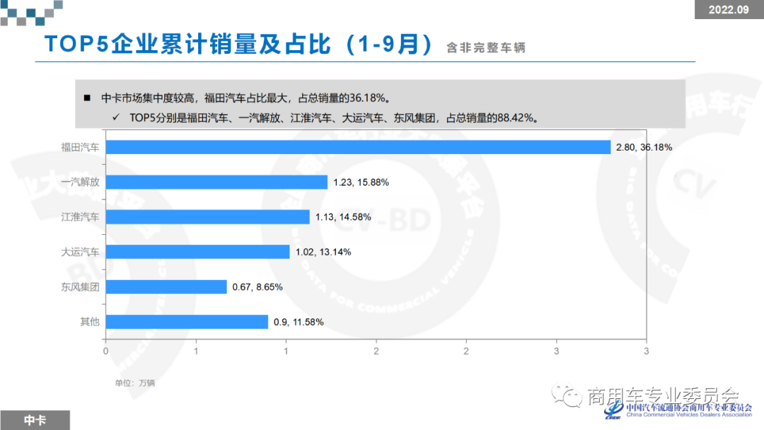 2022年9月中卡总批发量0.65万辆,同比下降39.84%