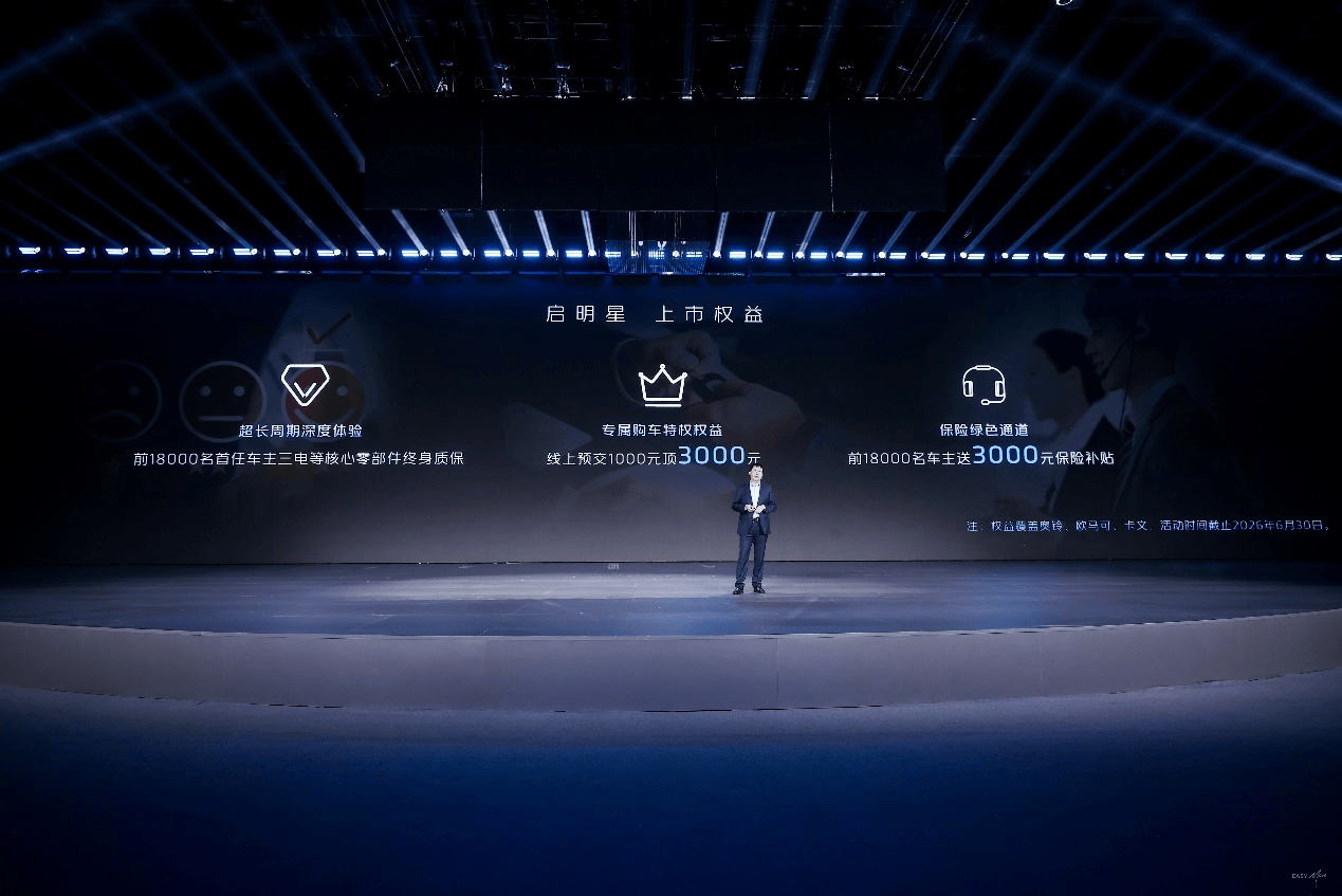 价格方面,启明星二级踏步车型提供标顶、高顶双版本,电池覆盖100-165度规格,搭载2C超充技术与三种碳化硅油冷高效电机,上市价16.88万元起;启明星一级踏步低入口车型入口高度仅470mm,配合1.88米标顶驾驶室,空间开阔通透;配备100-140度电池与2C超充技术,上市价17.09万元起。同时推出三重上市专属权益,权益一:前18000名首任车主,可享三电等核心零部件终身质保,养车、用车更省心;权益二:线上预交1000元,购车直接抵扣3000元,轻松省下购车成本;权益三:前18000名购车车主,直接赠送3000元保险补贴,用车更安心。以上权益在2026年6月30日前有效,先到先得,可叠加享受。