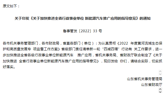 近日,山东省机关事务局、省财政厅联合出台《关于加快推进全省行政事业单位新能源汽车推广应用的指导意见》。意见明确,加快推进新能源汽车推广应用,要坚持多措并举,加大力度合理配置、使用新能源汽车,有效解决公务出行保障难、新能源汽车推广不平衡等问题,到2025年,除特殊工作要求外,全省行政事业单位新能源汽车采购占比达到100%,实现公务出行“绿色低碳、环保节约”的目标。