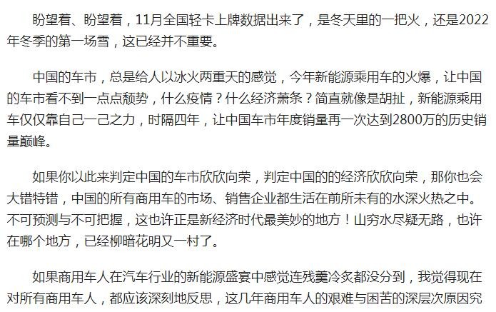 据中国汽车工业协会统计分析,2022年9月,商用车市场表现依然相对低迷,商用车作为生产资料的属性,与宏观经济、基建投资、房地产投资等因素高度相关,市场的恢复难度更大。